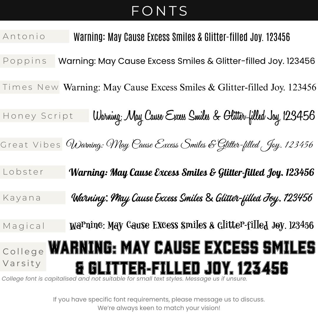 Due to the nature of personalised printing, we may adjust text placement, symbol use, or sizing to best suit your chosen wording. Text only, no emojis or other symbols supported. Final designs may differ slightly from example images. Every effort is made to deliver a balanced and polished result and any significant changes will be discussed prior.